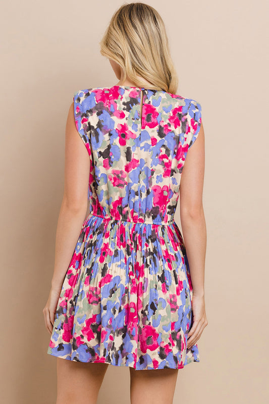 Abstract Floral Printed Shoulder Padded Dress