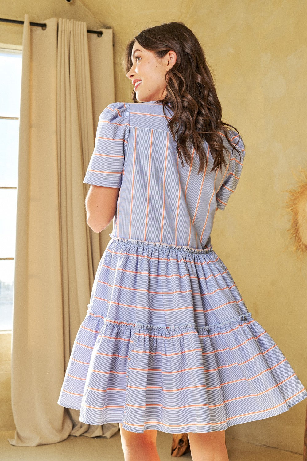 This vibrant dress boasts a unique striped pattern in bold orange and blue. The V-neck and short sleeves add a touch of femininity, while the ruffle skirt and tiered design bring an element of fun and playfulness. Perfect for adding some flair to any occasion!