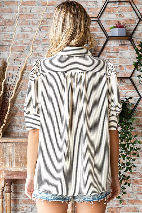Add some fun to your wardrobe with this relaxed fit shirt! Featuring a concealed button closure, button cuffed short sleeves, and a collared neckline, this shirt is both stylish and playful. The shirred shoulders add a touch of whimsy to this striped piece.